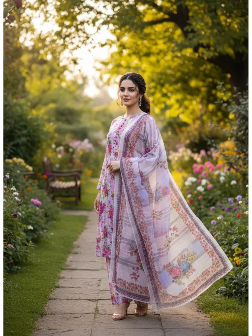 Looking for a stylish yet comfortable Eid outfit that won’t break the bank? This 3-piece stitched cotton lawn printed suit is perfect for Pakistani women who want to shine at weddings, family gatherings, or office parties without compromising on comfort or elegance. Designed with breathable cotton lawn fabric, it keeps you cool during Pakistan’s hot summers while offering a chic, printed look that’s both trendy and timeless. The multicolor design adds a festive touch, making it ideal for any celebration. Durable stitching ensures it lasts through multiple wears, and the premium quality material feels soft against the skin. This suit is thoughtfully crafted for everyday elegance and special occasions alike. The shirt, trousers, and dupatta are all made from the same lightweight cotton lawn, ensuring uniform comfort and style. The printed patterns are vibrant and eye-catching without being overwhelming, making it easy to pair with accessories. The fit is generous enough for a regular build, with measurements tailored for comfort — shirt chest 21 inches, trouser waist 34 inches, and lengths that suit most frames. As a new arrival, it’s available at the best price in Pakistan, making it a smart investment for your wardrobe. Whether you’re dressing up for Eid or a casual party, this set delivers both style and value. – Made from premium quality cotton lawn fabric for breathability and comfort – Stylish multicolor printed design perfect for Eid, weddings, or parties – Durable stitching ensures long-lasting wear and everyday use – Includes 3 pieces: 1 shirt, 1 trouser, 1 dupatta for complete outfit – Ideal fit for regular body types with generous sizing – New arrival at best price in Pakistan for maximum value